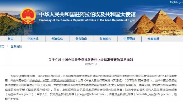 中国驻埃及大使馆于2月17日发布通知称,自2021年3月2日起,所有自埃及出发搭乘航班赴华的在埃中国公民需在参加航空公司闭环管理前自行进行14天隔离管理,并由所属单位(中资企业、侨团、学联或当地任教院校)出具《申请人已自行隔离满14天证明》。