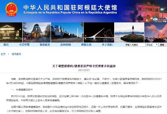 据中国驻阿根廷大使馆网站消息,自2月24日起,驻阿根廷使馆仅受理始发地为阿根廷、且仅在第三国中转一次的赴华人员健康码申请。驻阿根廷使馆不为周边国家到阿根廷中转赴华人员以及自阿根廷始发、中转两次或以上赴华人员审发健康码。