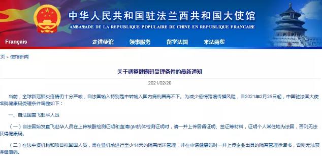 中国驻法国大使馆2月19日发布通知称,自2021年2月26日起,自法国始发直飞赴华人员在上传核酸检测证明和血清IgM抗体检测证明时,需要一并上传居留证明、签证等材料,证明个人常住地为法国,否则无法获得健康码。