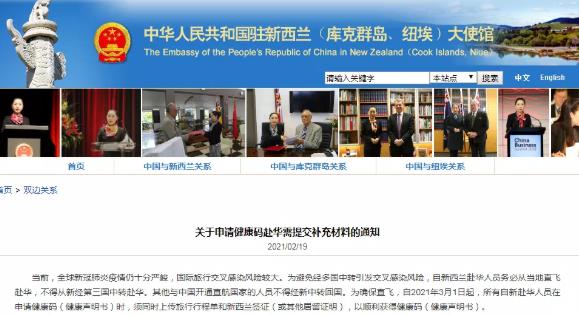 中国驻新西兰大使馆2月19日发布了《关于申请健康码赴华需提交补充材料的通知》。