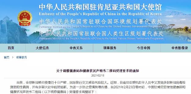 中国驻肯尼亚大使馆2月18日发布消息称,自2021年2月23日零时起,所有拟乘机自肯或经肯中转赴华人员向使馆申领健康码时,除上传符合要求的检测报告外,还需上传完整行程单、在肯居留证明(如居留许可、签证等)或有肯尼亚入境章的护照页扫描件。