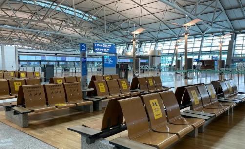 资料图:当地时间3月4日,韩国仁川机场内保持社交距离的提示。(记者 曾鼐 摄)
