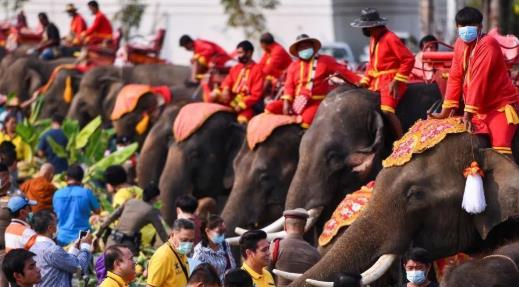 资料图:当地时间3月13日,泰国大城府举行大象日庆祝活动。