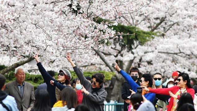 游客在青岛中山公园的樱花树下翩翩起舞,享受美好春光。 王海滨 摄