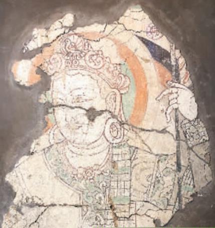 达玛沟佛寺遗址的毗沙门天壁画原作(上图)和毗沙门天壁画临摹作品(下图,中国艺术研究院工笔画院专职画家王菽一作)。