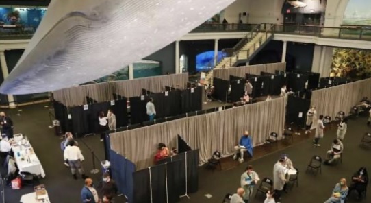 资料图:当地时间4月23日,位于纽约的美国自然历史博物馆开辟米尔斯坦海洋生物大厅为新冠疫苗接种点,为18岁以上的纽约居民接种新冠疫苗。中新社记者 谭宏伟 摄