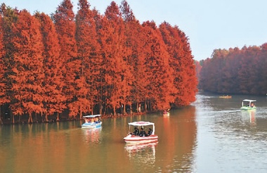 上海奉贤海湾森林公园,游客泛舟百鸟湖上观赏落羽杉。杨建正摄(人民图片)