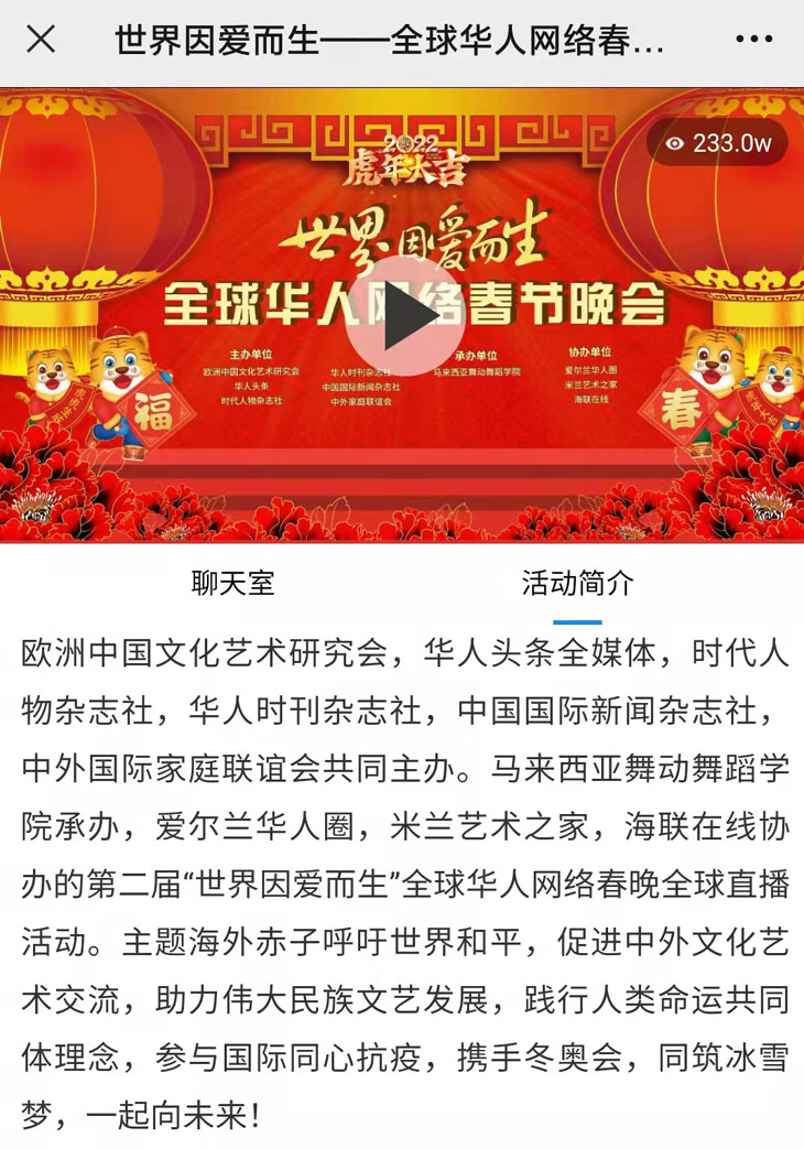 2022年(第二届)"世界因爱而生"全球华人网络春晚由欧洲中国文化艺术研究会、华人头条全媒体、时代人物杂志社、华人时刊杂志社、中国国际新闻杂志社、中外国际家庭联谊会共同主办,马来西亚舞动舞蹈学院承办,爱尔兰华人圈、米兰艺术之家、海联在线协办。晚会主题为:海外赤子呼吁世界和平,促进中外文化艺术交流,助力伟大民族文艺发展,践行人类命运共同体理念,参与国际同心抗疫,携手冬奥会,同筑冰雪梦,一起向未来!