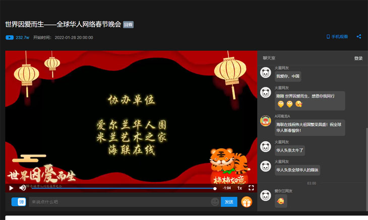 海联在线西安1月29日电 春晚直播迎虎年,全球华人庆新春。北京时间1月28日20点整,备受全球华人关注的2022(第二届)"世界因爱而生"全球华人网络春晚准时在"华人头条"等平台向全球直播,海联在线作为协办单位,也多次发布预告、直播等信息,为晚会直播预热作出了积极贡献,此外,还专栏设置直播链接,方便全球华人收看直播。直播受到全球华人热烈欢迎,华人社团组织华人和国际友人准时并全程收看了节目,晚会直播结束时浏览量高达210.7万,晚会虎虎生威,取得了圆满成功!
