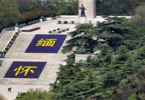 3月29日,清明节将至,南京雨花台烈士陵园内的烈士纪念碑前布置了由鲜花组成的“缅怀”字样花坛,缅怀革命先烈。中新社记者 泱波 摄