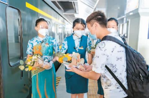 中老铁路不仅极大方便了老挝民众出行,也推动了中老两国旅游业发展。6月23日,中老铁路旅游专列首发仪式在昆明举行,“坐着火车游云南”活动正式开启。图为当日,该专列乘务员为乘客送上鲜花。陈 畅摄(新华社发)