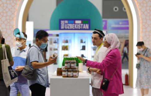 8月14日,参观者在第六届丝绸之路国际博览会主宾国乌兹别克斯坦展区上了解当地特色商品。 新华社记者 李一博 摄