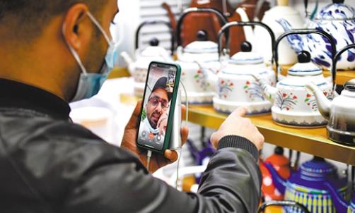 1月14日,也门客商在浙江义乌国际商贸城选购茶壶,同时通过视频向沙特客户介绍价格和库存。新华社记者 黄宗治摄