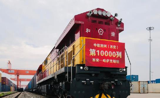 8月11日上午9时30分,满载着布料、载客电梯、暖气片等50车货物的X9041次中欧班列“长安号”,从西安国际港站开出,驶向哈萨克斯坦阿拉木图。据了解,这是中欧班列“长安号”累计开行的第10000列。