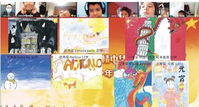 图为疫情期间,中意国际学校华裔青少年书画大赛作品参与网络评比展示。(受访者供图)