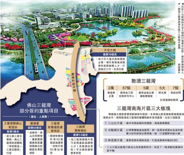 9日,佛山融入粤港澳大湾区建设的重大平台三龙湾迎来一周年重大项目签约活动。当天,三龙湾新签约15个重大项目,投资规模达到352亿元(人民币,下同)。三龙湾将大力发展总部经济,出台扶持政策,吸引北上广深以及港澳等地优质企业到三龙湾设立总部。投资额约70亿、名为三龙湾(南海)天空之城的“香港城”项目也签约落地,项目配套向港人销售的楼盘和招收港生的国际学校,致力引入香港专业协会、金融、商业等高端服务业企业,吸引香港高端服务和双创人才落户。