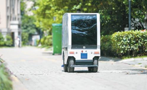一辆5G无人配送车自动行驶在浙江省湖州市长兴县雉城街道水木花都社区。谭云俸摄(人民视觉)