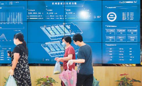浙江省杭州市5G农贸市场——骆家庄农贸市场的大屏幕上实时显示交易、客流等相关情况。新华社记者 韩传号摄