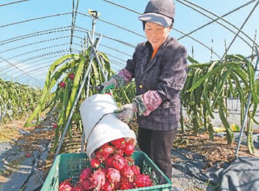10月10日,果农正在台湾农创园内采收红心火龙果