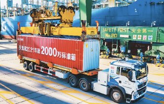 12月18日,天津港年集装箱吞吐量首次突破2000万标准箱,创历史新高。图为集装箱在天津港被吊装上船。本报记者 靳 博摄