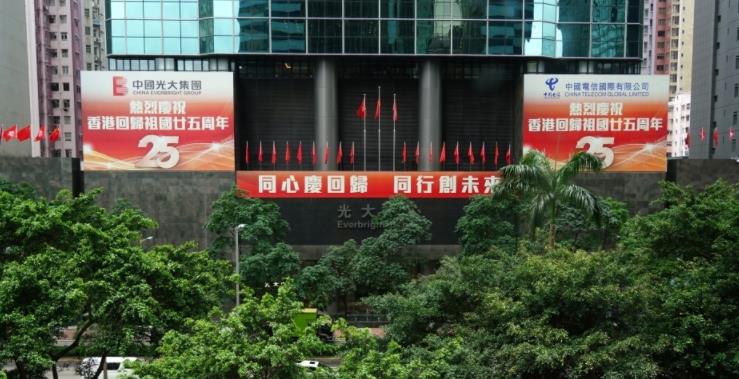 6月21日,香港中环街头的大屏幕正在循环播放庆祝香港特区成立25周年的宣传广告。随着香港回归25周年纪念日临近,香港街头到处洋溢着庆回归的喜庆气氛。 中新社记者 张炜 摄