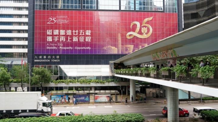 6月21日,张贴在香港入境事务大楼外墙的庆祝香港回归祖国25周年巨幅广告格外醒目。随着香港回归25周年纪念日临近,香港街头到处洋溢着庆回归的喜庆气氛。 中新社记者 张炜 摄