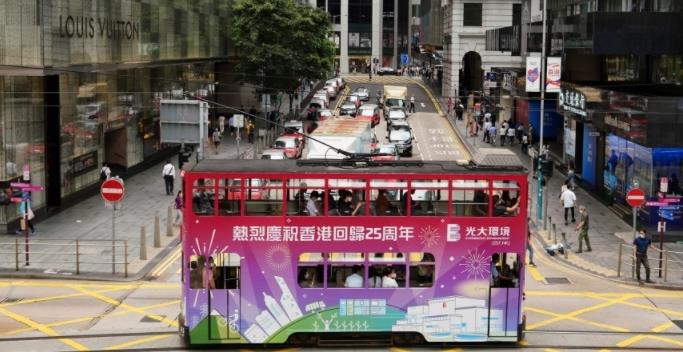 6月21日,一辆车身贴有庆祝香港回归25周年的电车经过中环街头。随着香港回归25周年纪念日临近,香港街头到处洋溢着庆回归的喜庆气氛。 中新社记者 张炜 摄