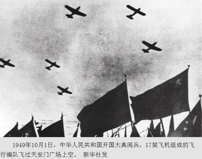 1949年10月1日,中华人民共和国开国大典阅兵,17架飞机组成的飞行编队飞过天安门广场上空,预示着中国共产党领导创建的人民空军即将诞生。