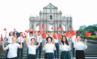 今年国庆前夕,“我和国旗合个影”活动在澳门大三巴牌坊前举行。新华社记者 张金加摄