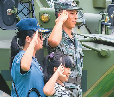 在驻澳部队军营开放日活动中,澳门居民向解放军战士学习敬军礼。澳门特区政府新闻局供图