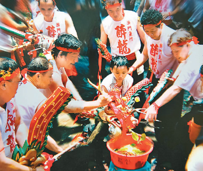 “舞醉龙”是在澳门渔商中间传承数百年的一项传统活动。图为澳门渔商在参与“舞醉龙”表演。新华社发
