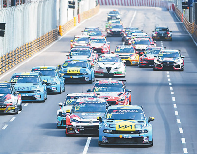 澳门格兰披治大赛车是澳门最重要的赛事活动之一,受到各国体育选手的广泛关注。图为选手们在比赛中。澳门特区政府新闻局供图