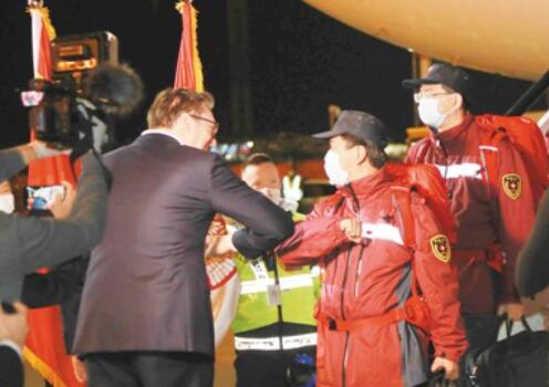 3月21日,在塞尔维亚首都贝尔格莱德,前来迎接的塞尔维亚总统武契奇(左)与中国援助塞尔维亚抗疫医疗专家组成员“碰肘”致意。中国援助塞尔维亚抗疫医疗专家组一行6人当晚乘专机抵达贝尔格莱德,由中国政府捐赠的一批医疗物资同机抵达。新华社记者 石中玉摄