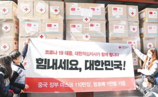 3月20日,在韩国仁川,韩国红十字会工作人员将中方援助物资装车后展示条幅,上面印有“加油,韩国!”的字样。新华社/纽西斯通讯社