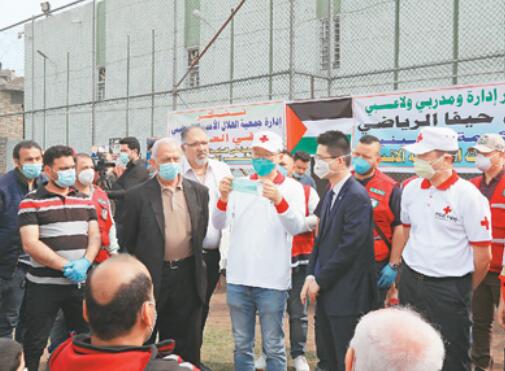 3月16日,在伊拉克巴格达东部的海法巴勒斯坦社区活动中心,中国专家演示正确的口罩佩戴方法。新华社发