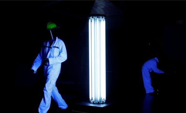 当地时间5月20日,受新冠肺炎疫情的影响,新加坡的一家商场启用了新帮手——“紫外线机器人”。图为工作人员在测试“紫外线机器人”的消杀工作进展。