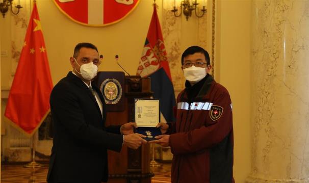 6月1日,塞尔维亚国防部长武林(左)在塞尔维亚首都贝尔格莱德向中国赴塞抗疫医疗专家组成员唐可京授予军队最高级别纪念勋章。 新华社记者 石中玉 摄