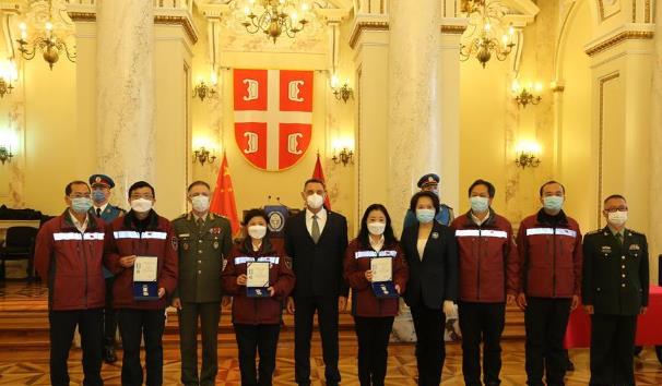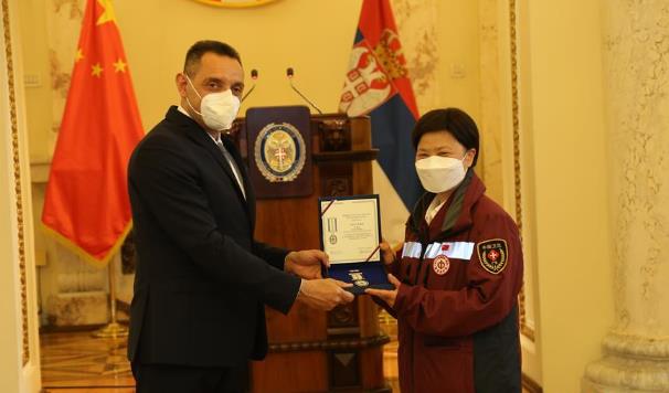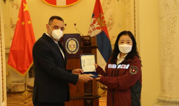 6月1日,塞尔维亚国防部长武林(左)在塞尔维亚首都贝尔格莱德向中国赴塞抗疫医疗专家组成员成守珍授予军队最高级别纪念勋章。 新华社记者 石中玉 摄