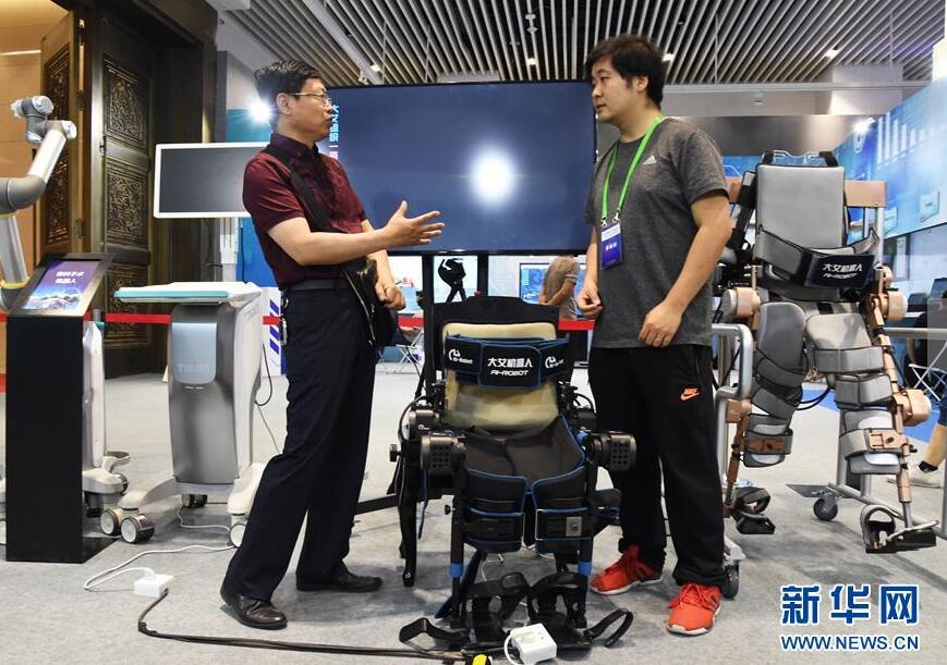 在2019年全国科技活动周暨北京科技周主场,观众向工作人员了解下肢外骨骼康复训练机器人情况(5月21日摄)。 新华社发(任超摄)