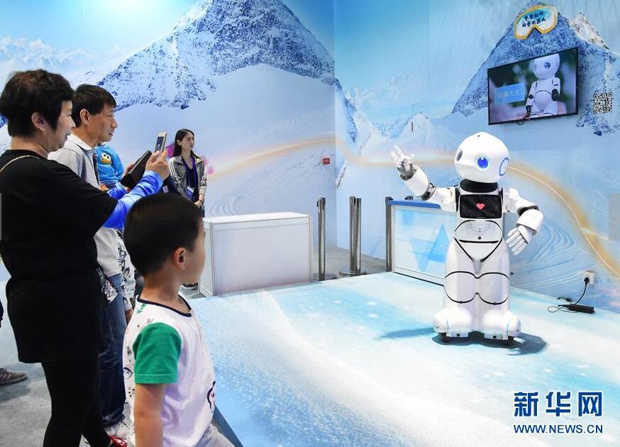 在2019年全国科技活动周暨北京科技周主场,观众参观类人型商务服务机器人表演(5月21日摄)。 新华社发(任超摄)