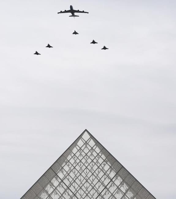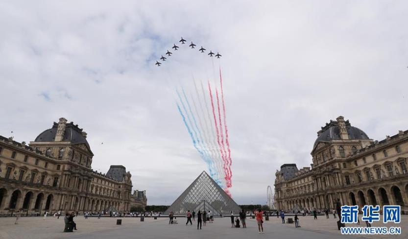 7月14日,“法兰西巡逻兵”飞行表演队飞过法国巴黎卢浮宫玻璃金字塔广场。 新华社记者 高静 摄