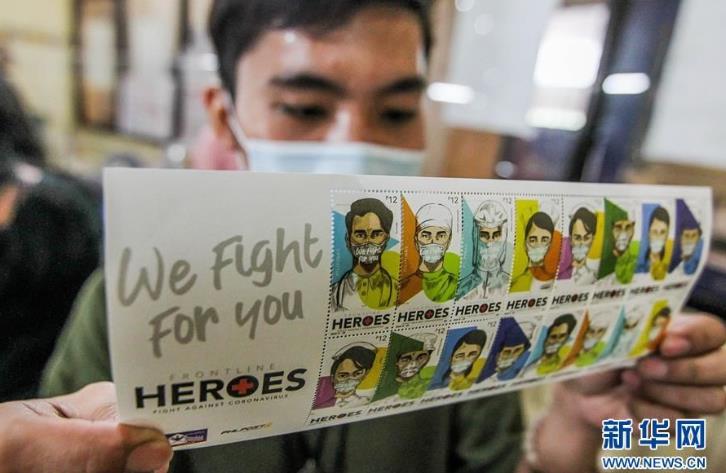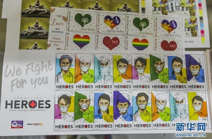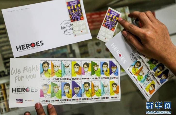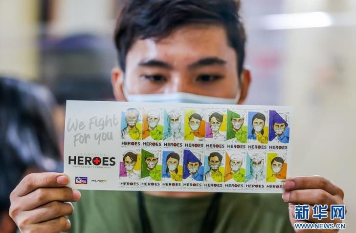 这是7月14日在菲律宾首都马尼拉拍摄的新发行的抗疫邮票。 菲律宾邮政公司近日发行特别邮票,将奋战在一线的抗疫人员描绘为“英雄”,向他们致敬。 新华社发(乌马利 摄)