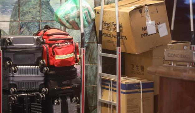 图为“先遣队”下午约4时30分到达住地九龙维景酒店,随车携带有多箱写有“深圳市人民医院”的卫生帽等医疗物资。 中新社记者 谢磊 摄
