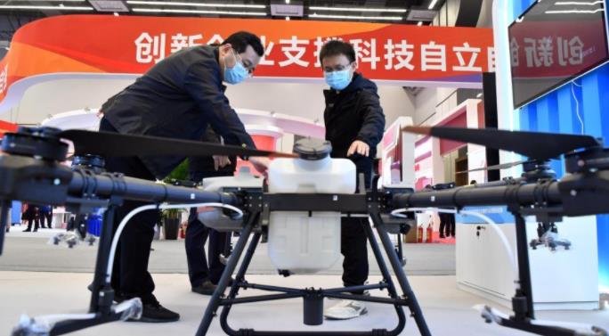 10月19日,在郑州主会场,工作人员(左)在介绍农用植保无人机。新华社记者 李嘉南 摄