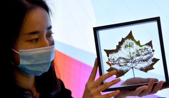 10月19日,在郑州主会场,工作人员在展示激光叶雕产品。新华社记者 李嘉南 摄