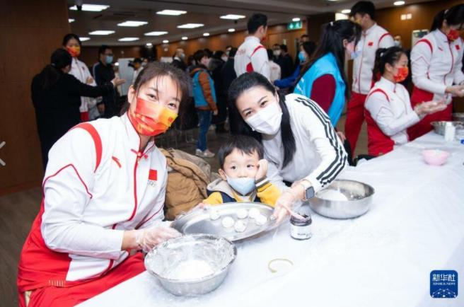 12月21日,在澳门街坊联合总会石排湾家庭及社区综合服务中心,内地奥运健儿代表团成员张灵(左一)与小朋友展示制作好的汤圆。