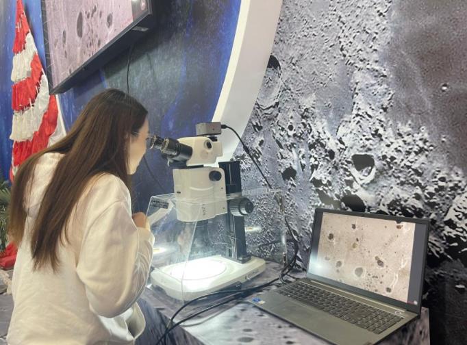 观众正在展览现场参观月壤样品。新华社记者吴慧珺 摄