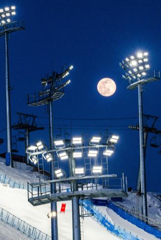 2月15日元宵佳节,一轮圆月映照张家口云顶滑雪公园。新华社记者肖艺九摄