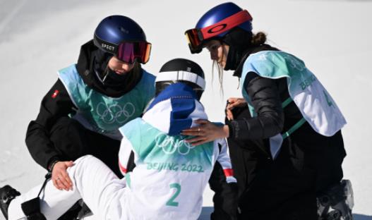 2月8日,谷爱凌(右)和瑞士选手玛蒂尔德·格雷莫德(左)在比赛后安慰法国选手苔丝·勒德。新华社记者薛宇舸摄