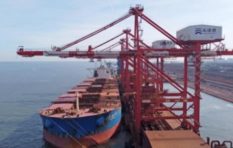 在天津港南疆港区26泊位,卸船机在进行卸货作业(1月28日摄,无人机照片)。新华社记者 赵子硕 摄
